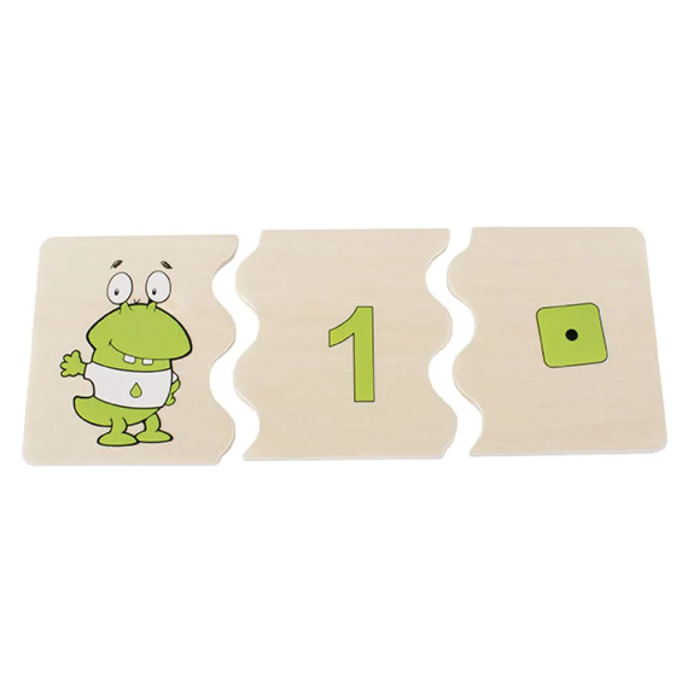 El mismo número se representa en diferentes formas en tres piezas del rompecabezas que van juntas. Pueden ver el número como una figura geométrica. para contar, como dígitos y en un dado.