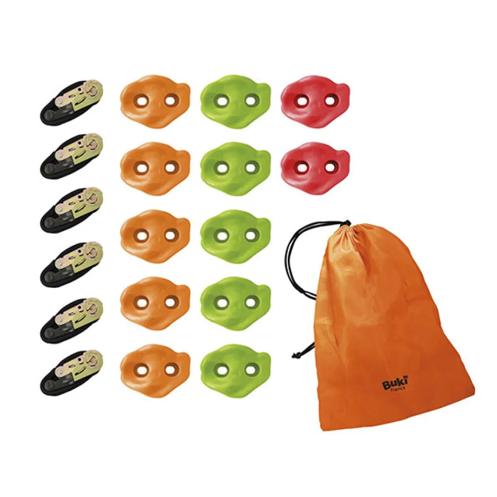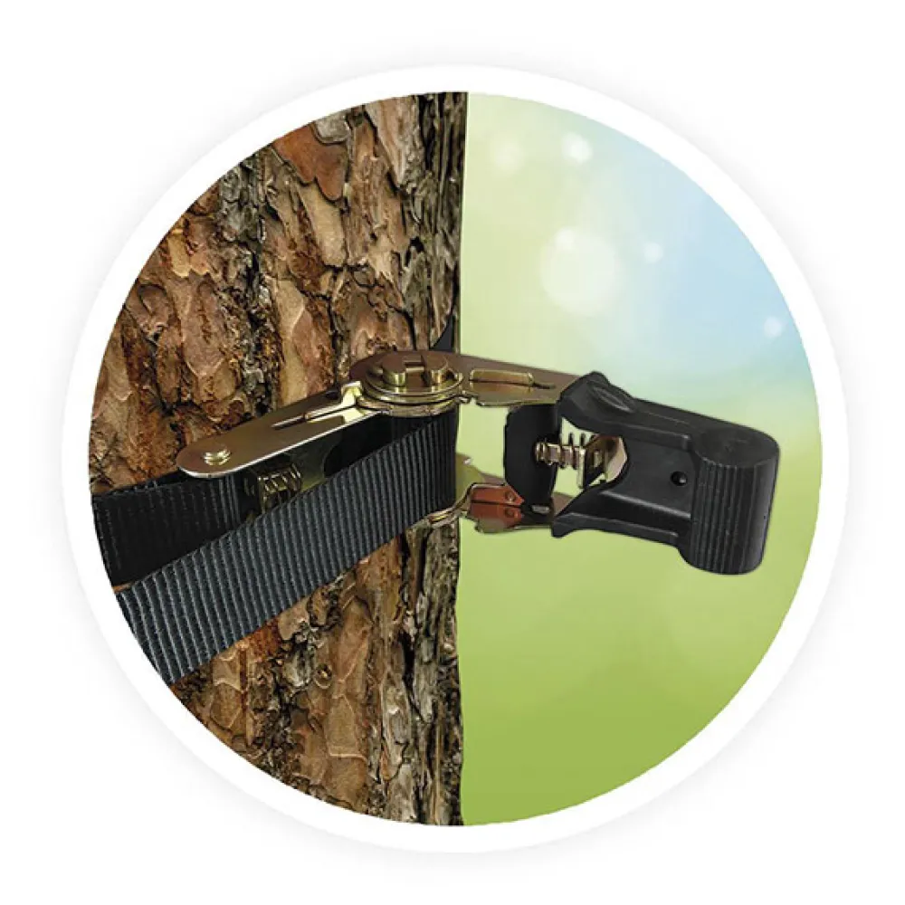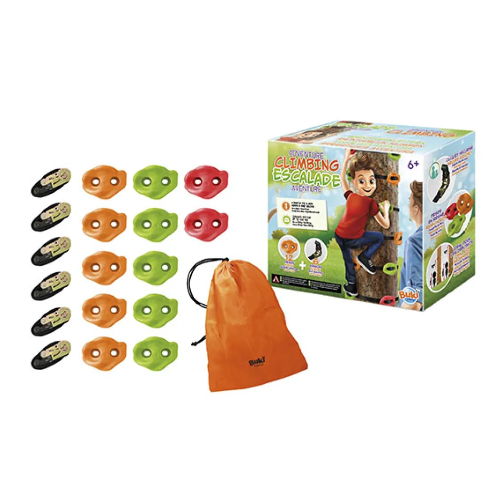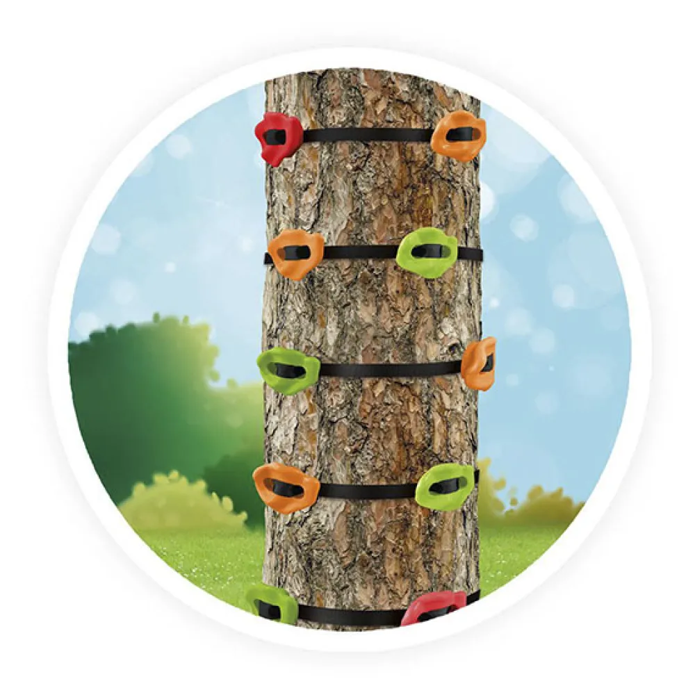 – Incluye: 6 cinchas y 12 presas que se colocan fácil y rápidamente en un árbol para crear circuitos de aventuras. Las cinchas van fijadas con trinquetes seguros.