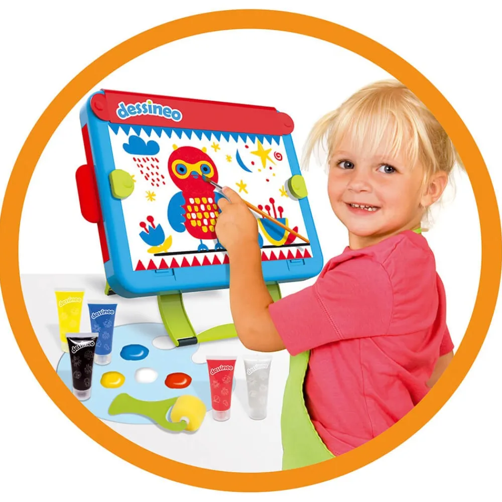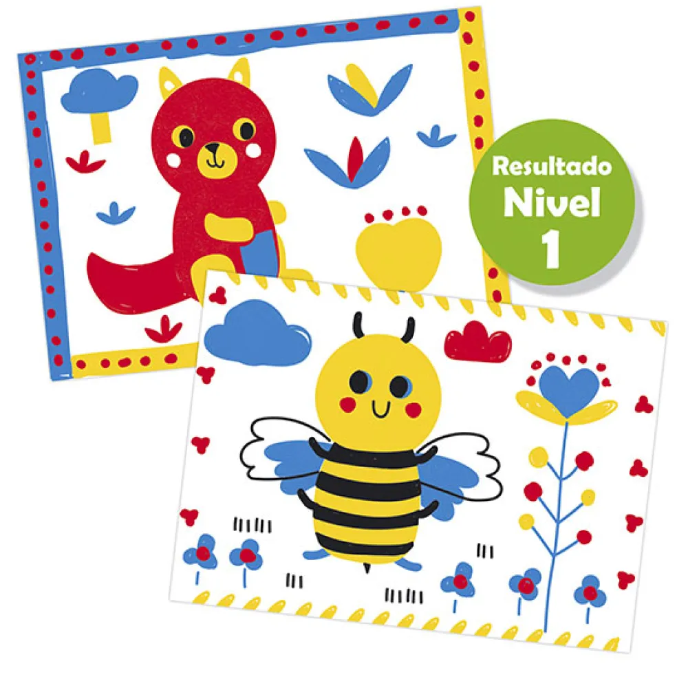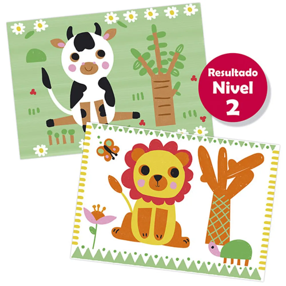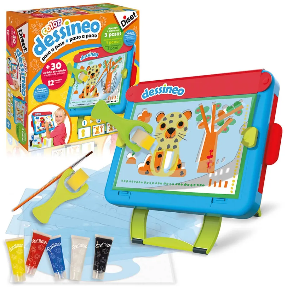 – Incluye: 1 caballete, más de 30 modelos de animales, 12 plantillas, 1 pincel, 1 rodillo, 5 tubos de pintura (amarillo, rojo, azul, blanco y negro).