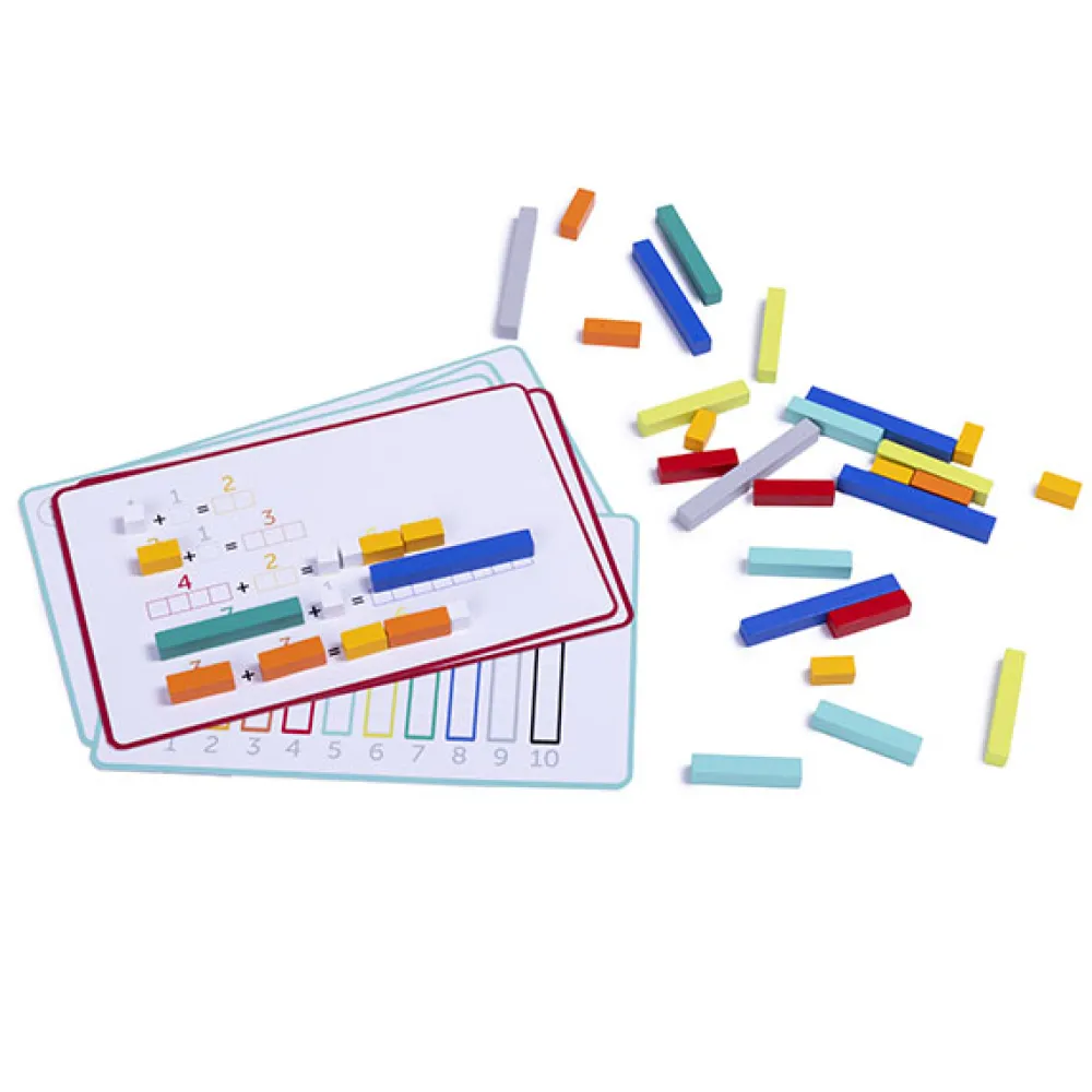 – Incluye 65 regletas de madera de diferentes colores y longitudes de 1 a 10 cm, y contiene 6 cartas de cartón con 12 diseños con distintas actividades, con dos niveles, el azul, nivel fácil y el rojo nivel superior.