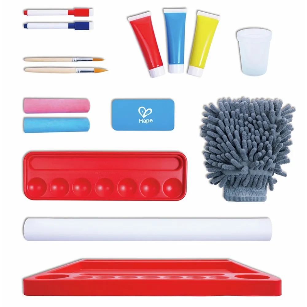 - Caballete 4 en 1 con pizarra blanca, de tiza, papel y superficie magnética.