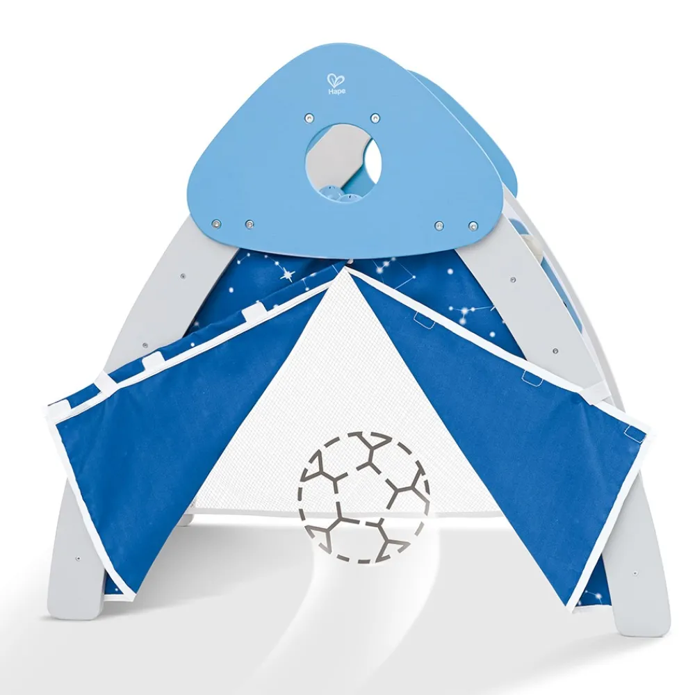 - 4 funciones en 1: tienda con forma de cohete, tobogán, portería y escalador.