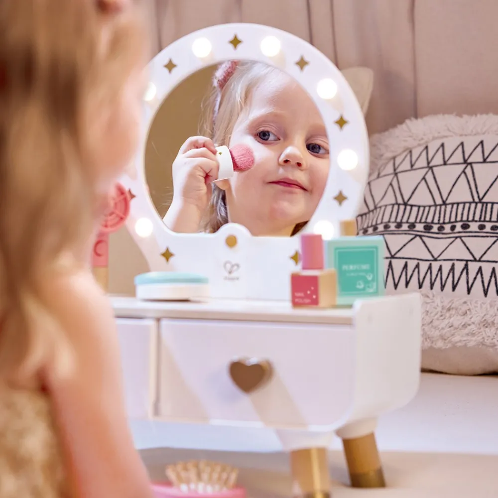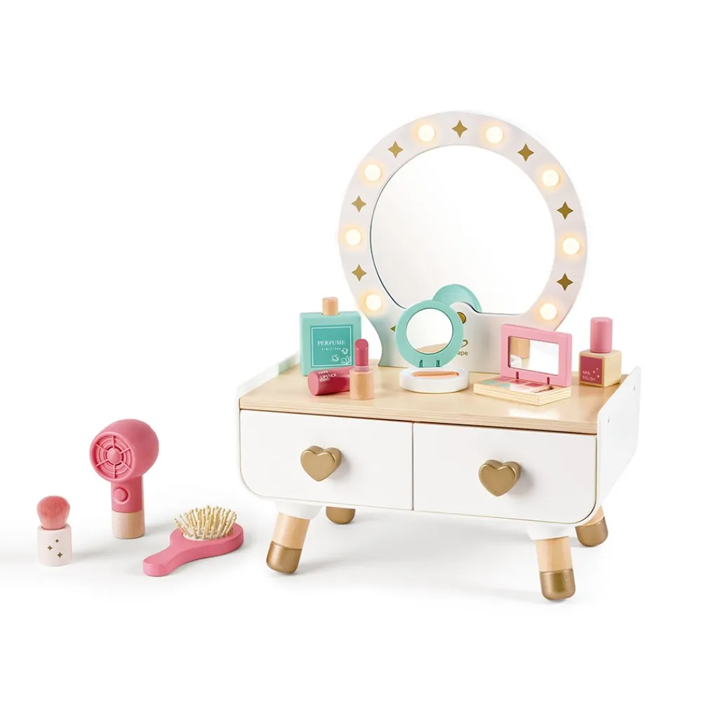 - Tocador de madera con iluminación que crea un ambiente acogedor.