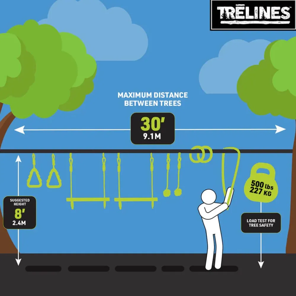 - Incluye 13 obstáculos: 2 columpios de cinturón suave (ajustables), 2 anillos de árbol, barra de doble trapecio, 2 anillos de gimnasia, enredadera de tres anillos, columpio de cuerda LED, 2 puños de mono y 2 retenedores de barra.