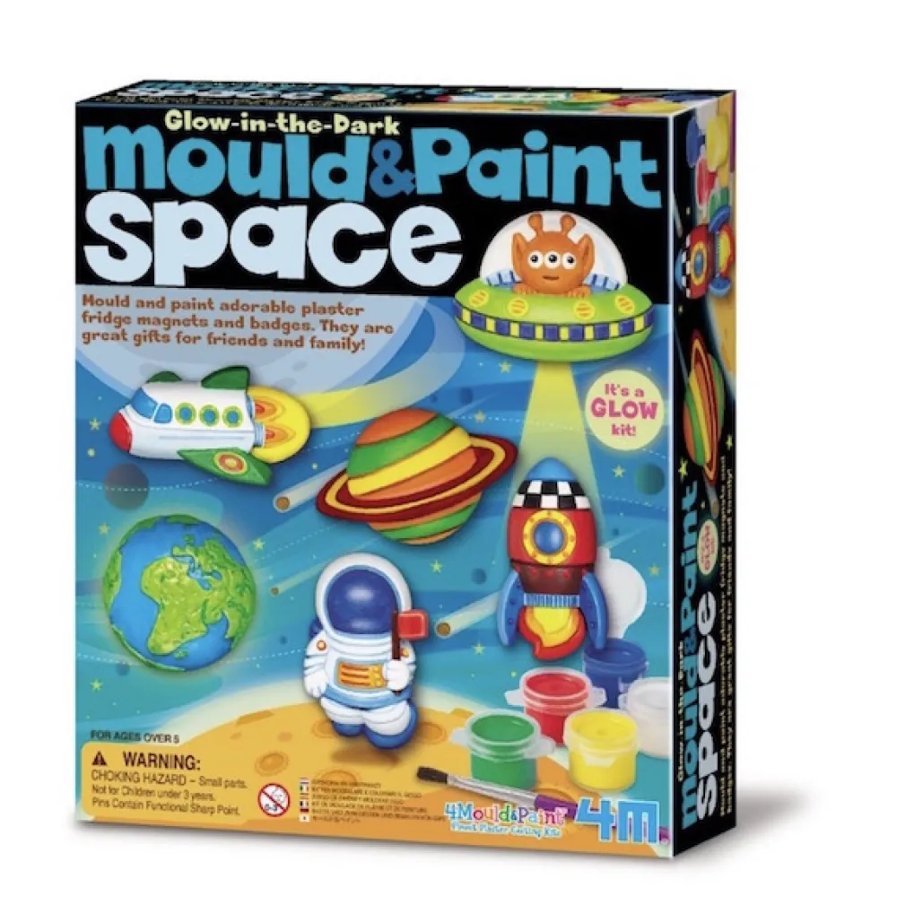– Incluye: pinturas (amarillo, verde, rojo, azul y blanco), pincel, yeso y 6 moldes (1 cohete, 1 nave espacial, 1 extraterrestre en un ovni, 1 astronauta, 1 Saturno y 1 Tierra).