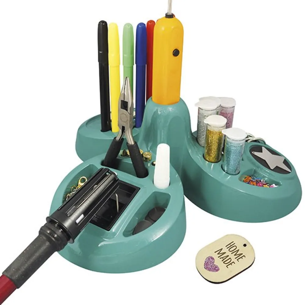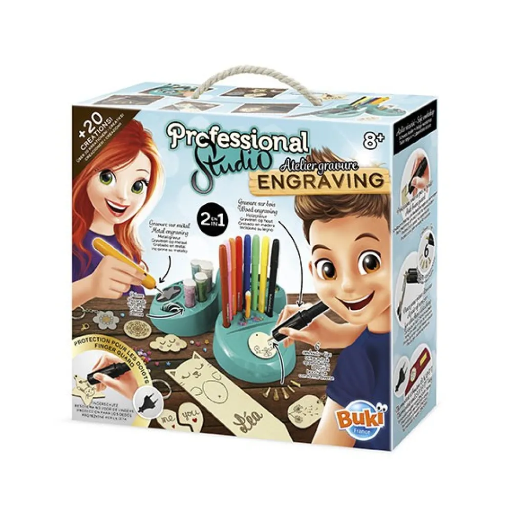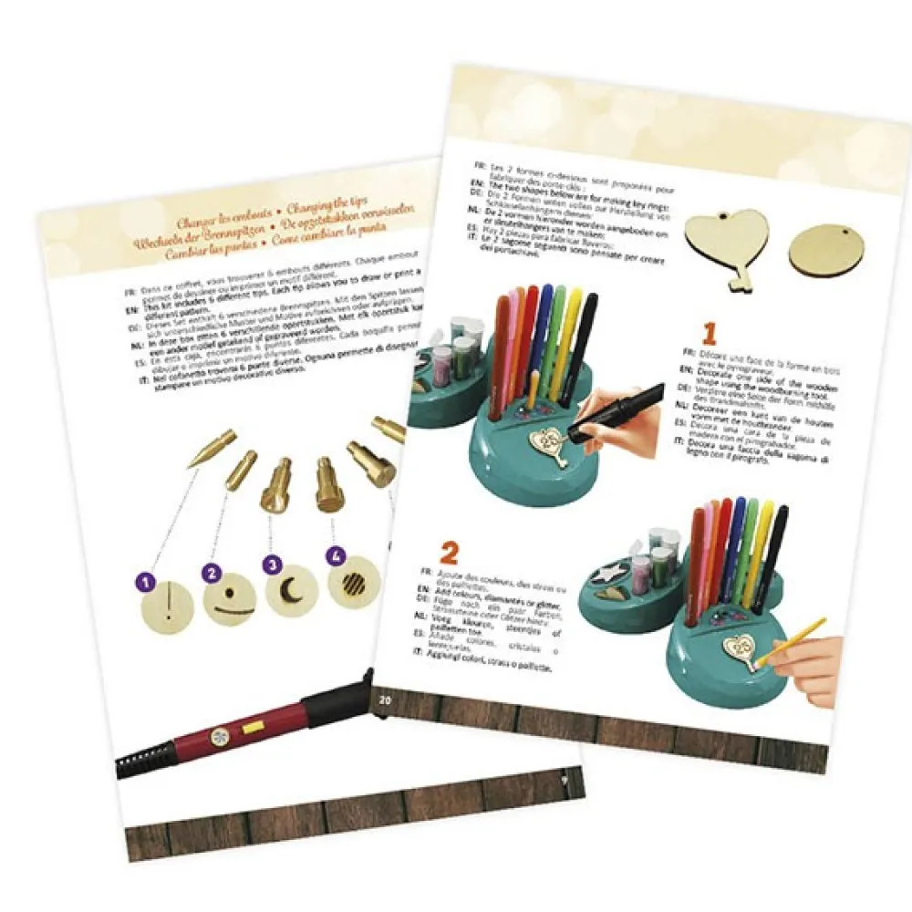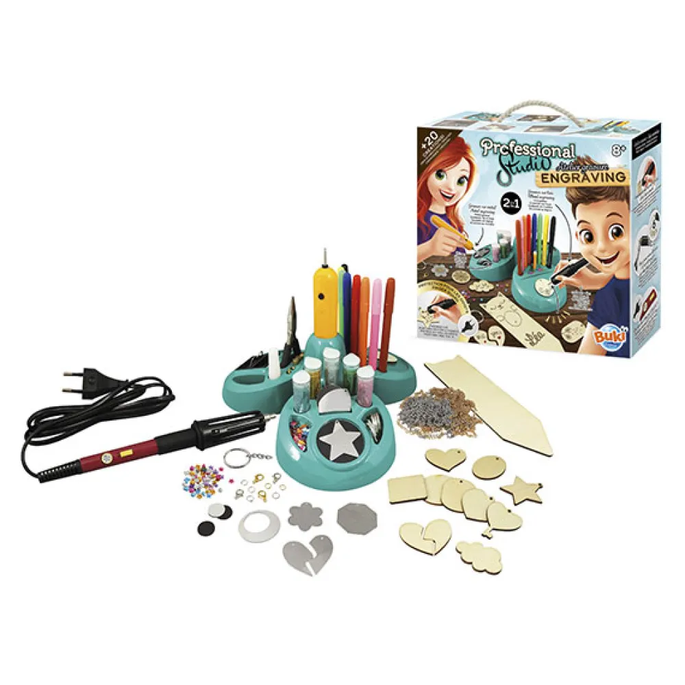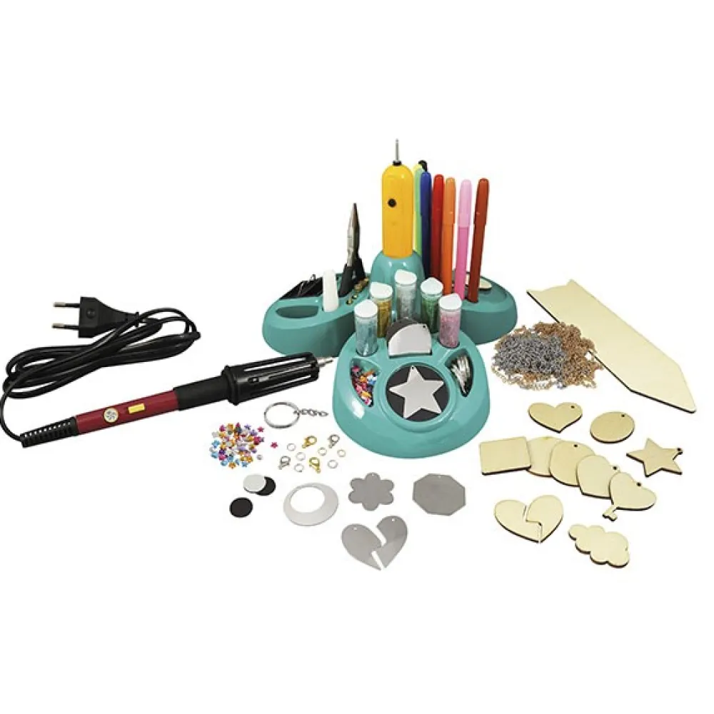 Taller para realizar grabados en madera y metal con total seguridad. Con este kit, los peques podrán crear y personalizar 5 imanes, 5 llaveros, 10 collares y 1 marcapáginas.El pirograbador dispone de una protección para no quemarse, un termostato para ajustar la temperatura y un botón ON/OFF. Una pinza permite que los adultos enrosquen, con toda seguridad, una de las 6 boquillas incluidas para grabar motivos diferentes. El grabador de metal permite dibujar motivos en placas de metal para después transformarlas en joyas o llaveros.