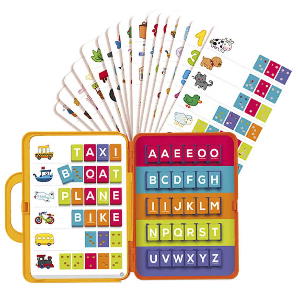 – Incluye un maletín, fichas de plástico de distinto color con las letras, 15 láminas con un total de 90 palabras y un manual de instrucciones.