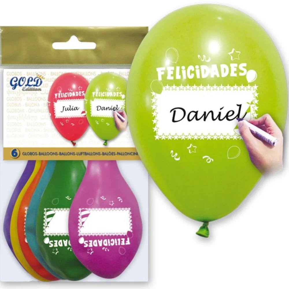 – Contiene: 6 globos de colores surtidos con espacio para escribir.