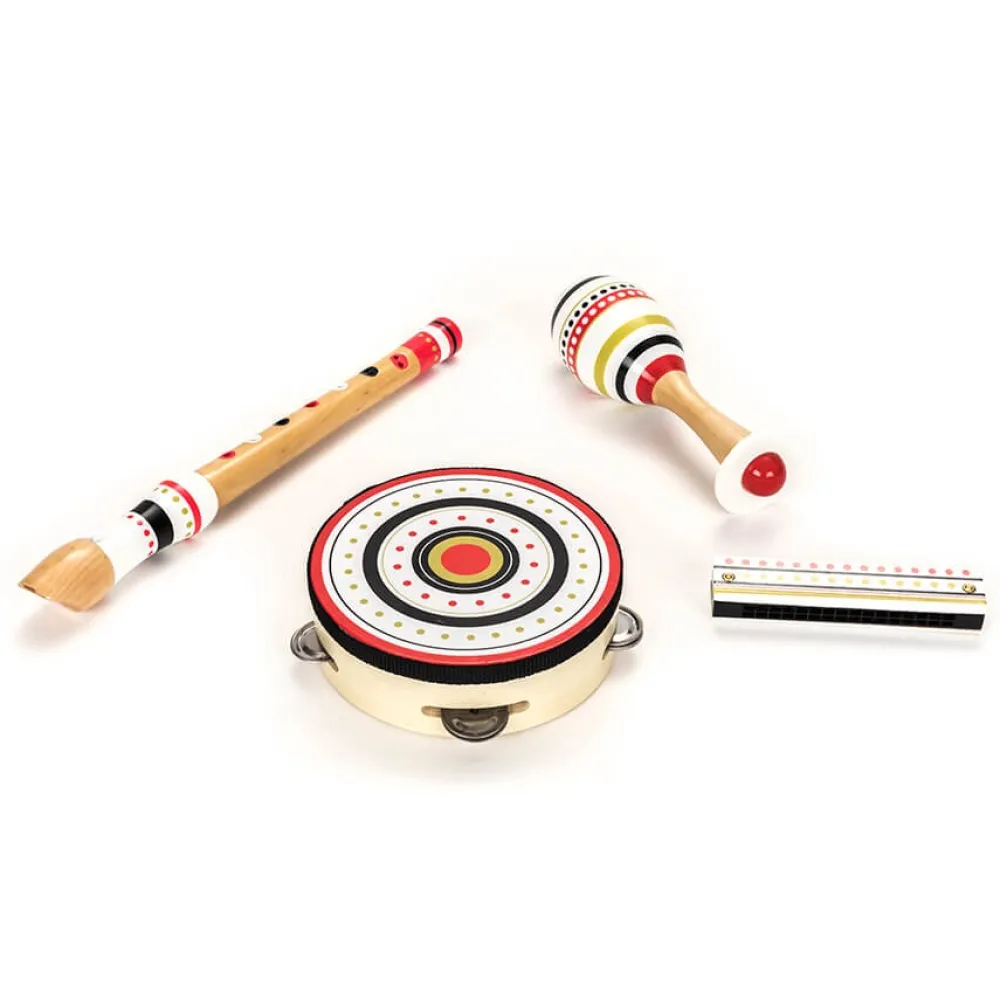 – Conviértete en todo un músico con el resto de instrumentos de la colección: maraca, flauta, armónica y pandereta.