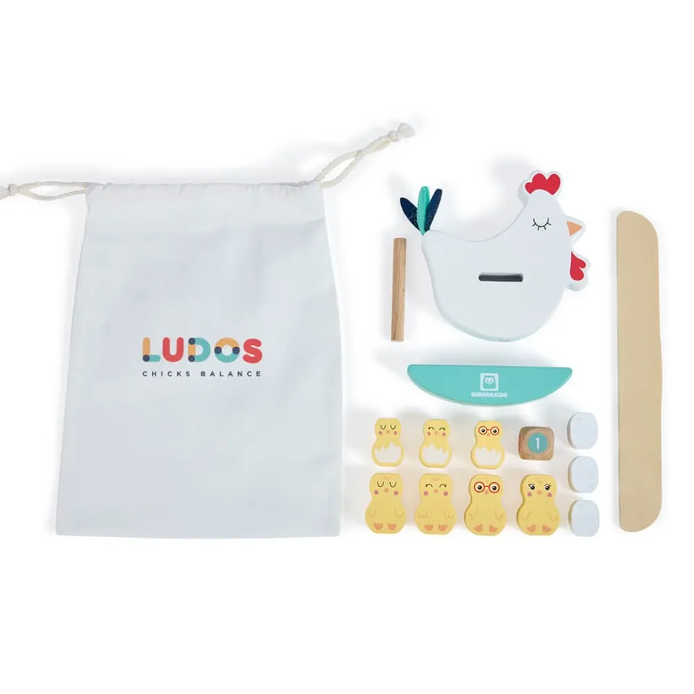 - Contiene 13 piezas de madera: una gallina, una base, el soporte de equilibrio para colocar los pollitos, 13 pollitos de distintos pesos y tamaños y un dado.