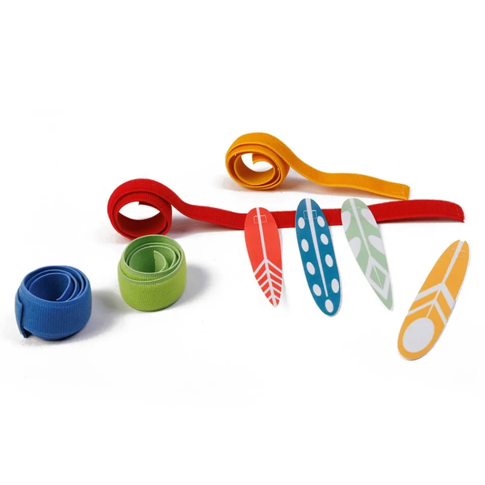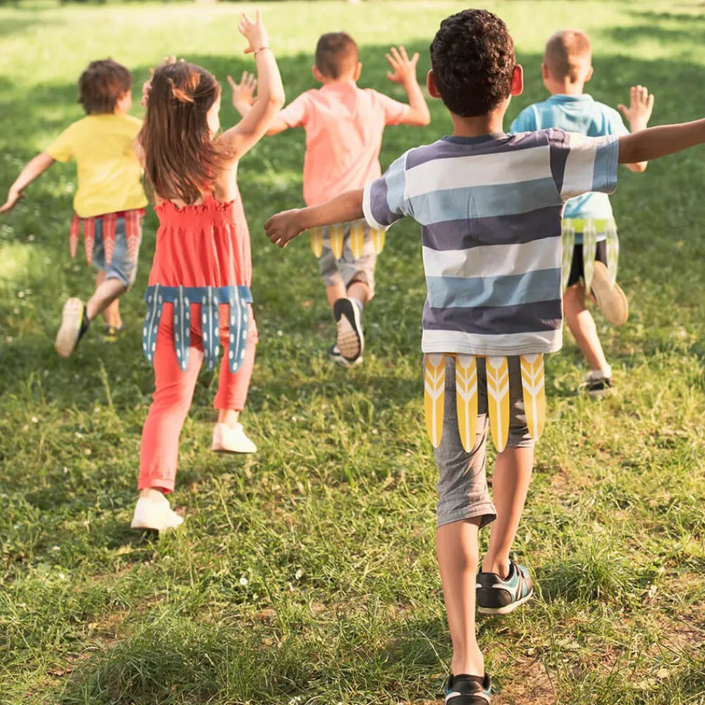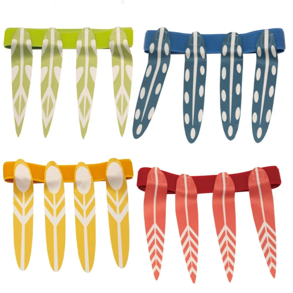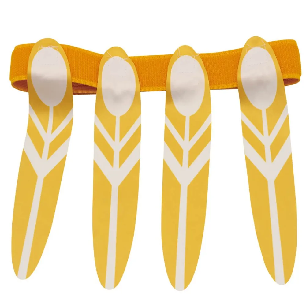 - Incluye 4 cinturones de distintos colores, cada uno con 4 plumas a juego.