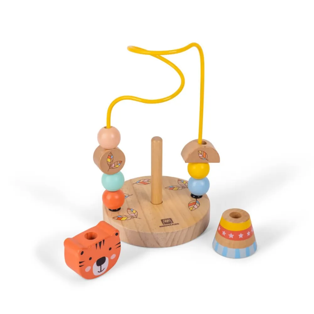 - Juguete de madera con dos opciones de juego: looping de cuentas y juego apilable.