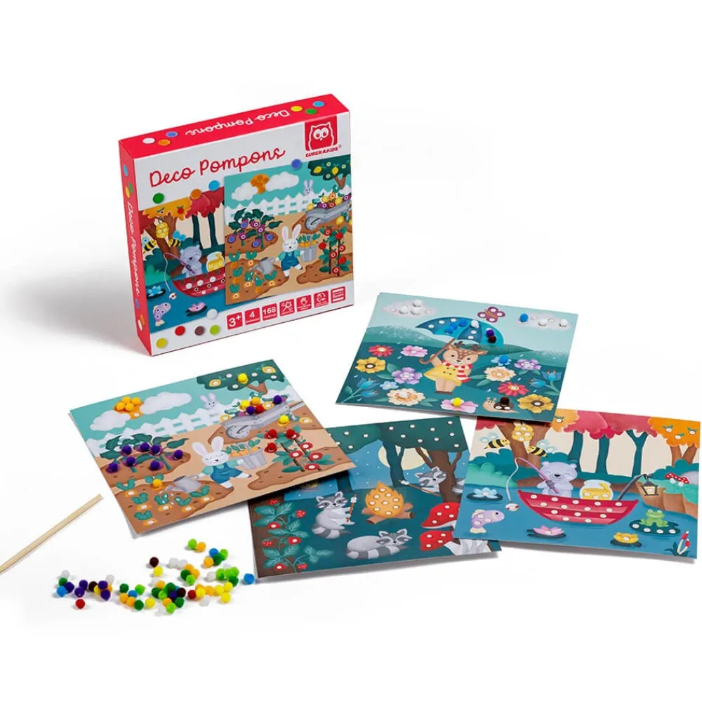 - Incluye 4 ilustraciones, pompones de 9 colores y 1 espátula.