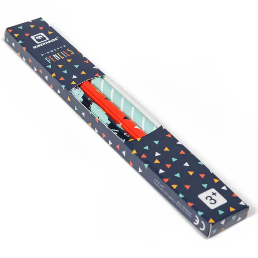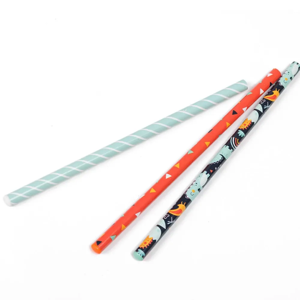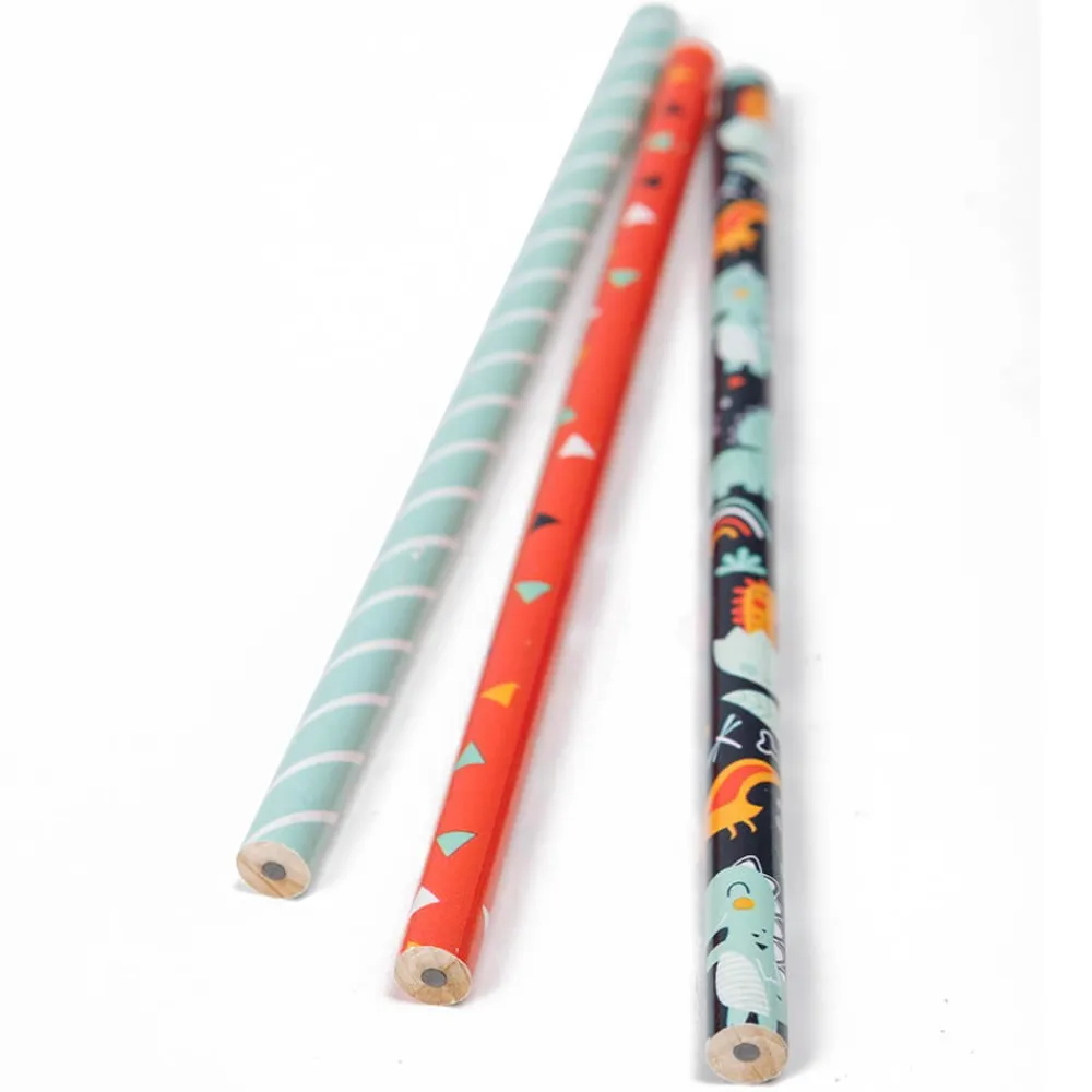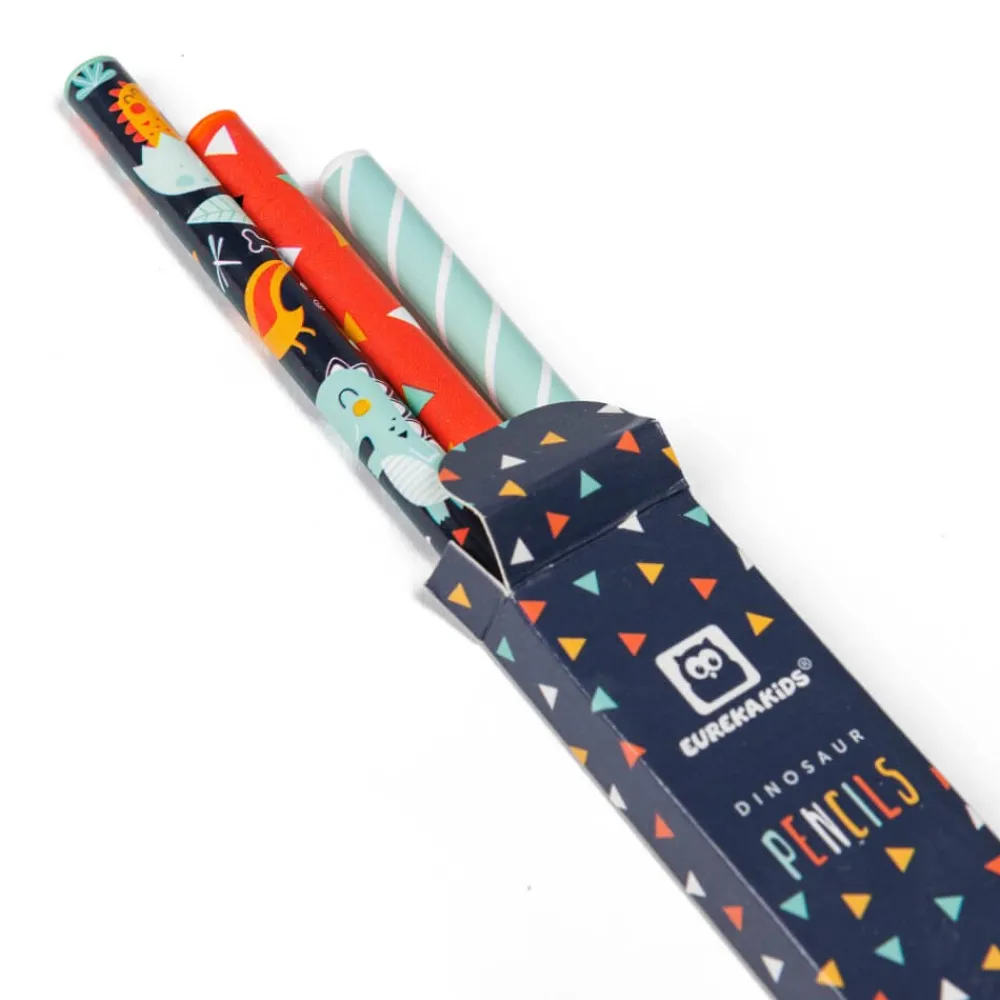 - Conjunto de 3 lápices con distintos diseños: dinosaurios, triángulos y espiral.
