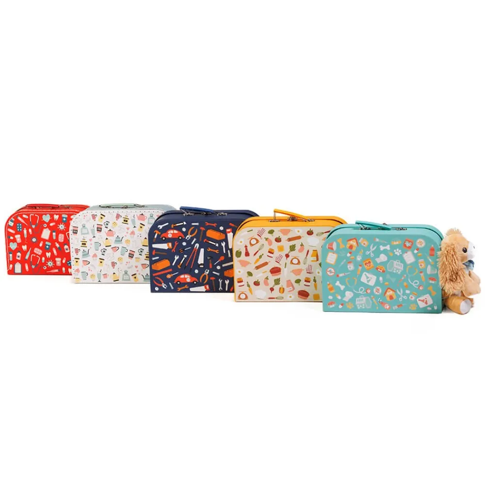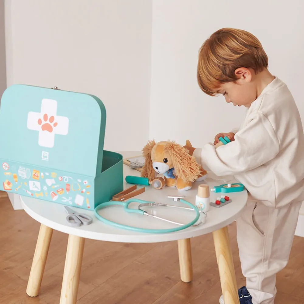 - 1 perrito de peluche, 1 soporte con notas de información del paciente, 1 estetoscopio, 1 par de guantes de látex, 1 caja con vendas realistas, 1 aguja de madera, 1 campana de protección textil, 3 pastillas, 1 termómetro de madera, 1 tijeras de madera, 1 botella de jabón antipulgas, 1 otoscopio de madera.