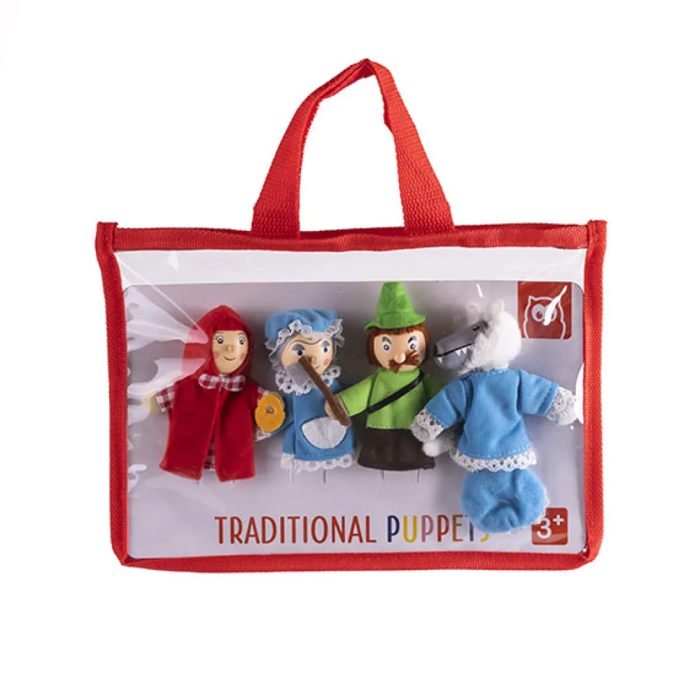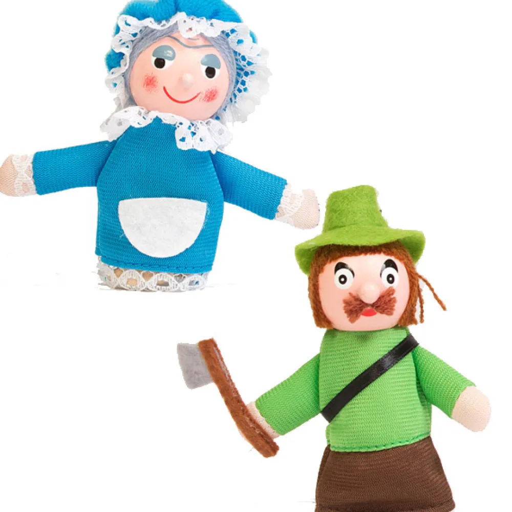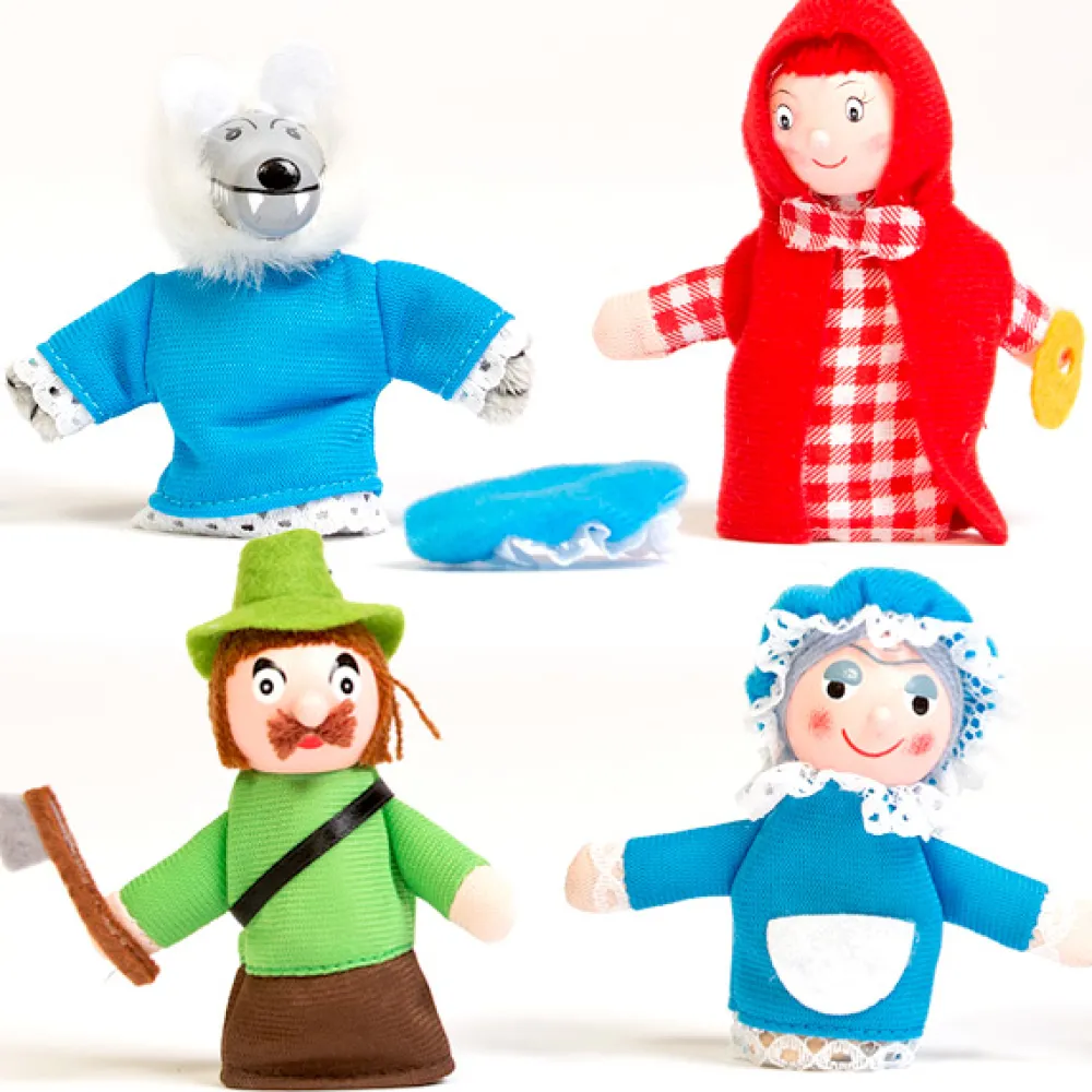 Con las marionetas de dedo de la capucita, el lobo, la abuelita y el leñador, los niños no se cansarán de oir una y otra vez la misma historia.