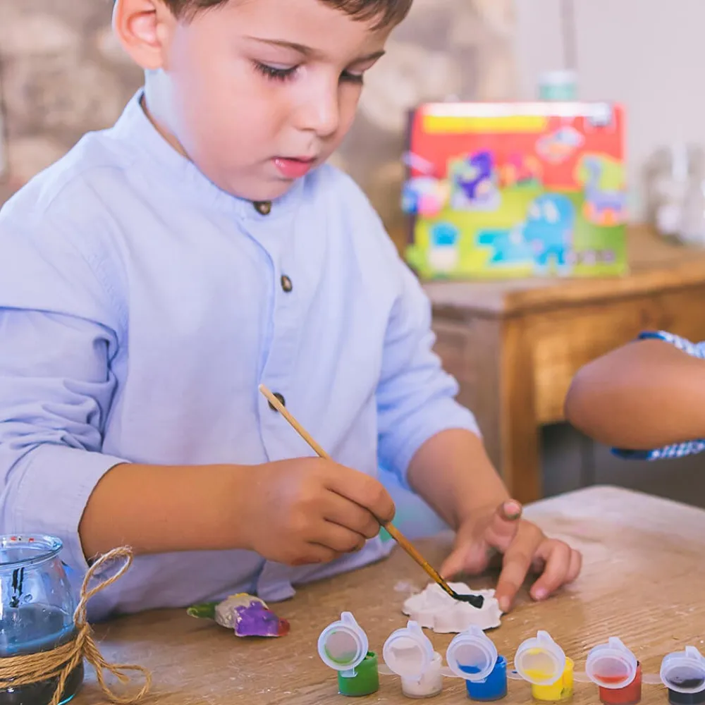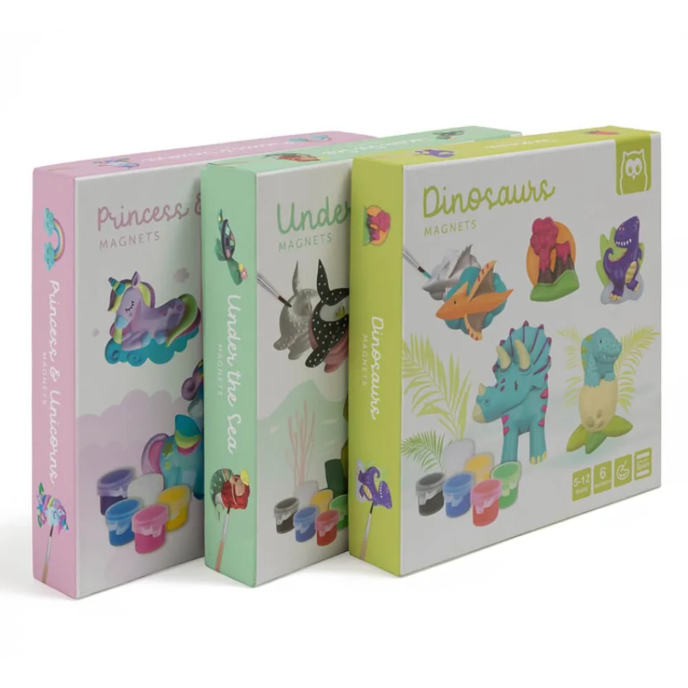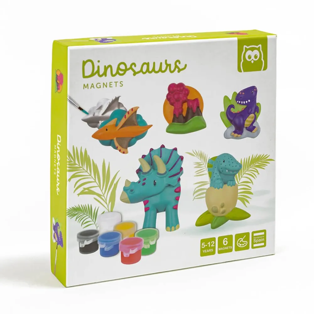 – Contiene un molde con 6 figuras, yeso en polvo, un pincel, 5 botes de colores y 6 imanes.