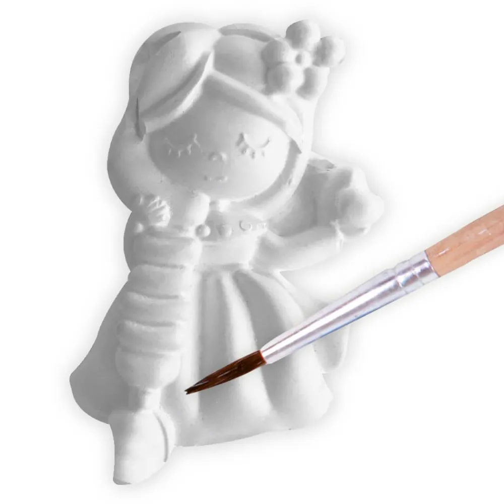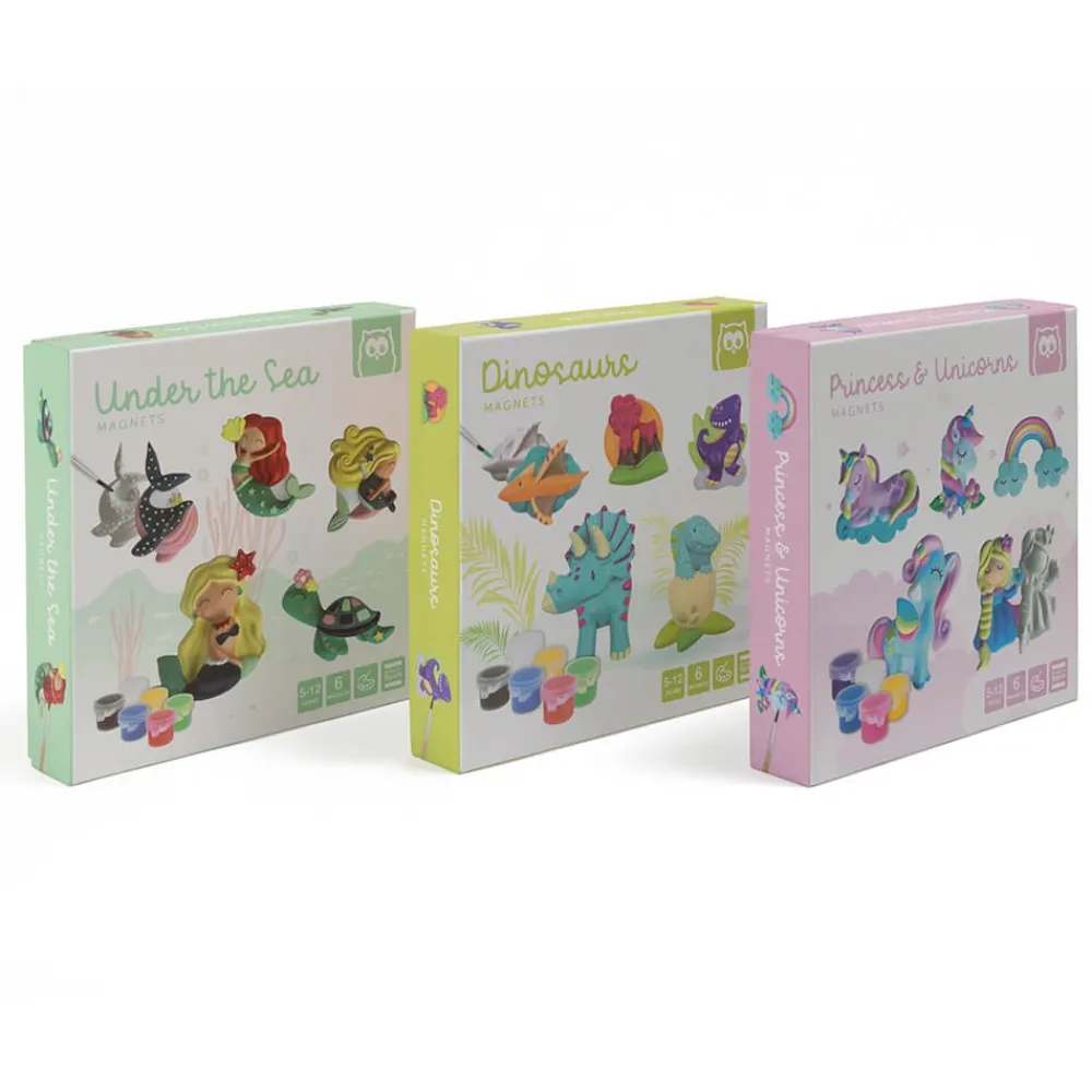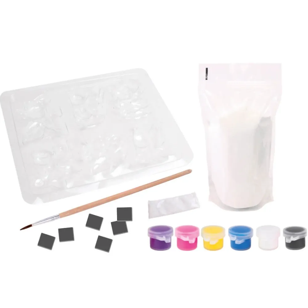 – Contiene un molde con 6 figuras, yeso en polvo, un pincel, 5 botes de colores y 6 imanes.