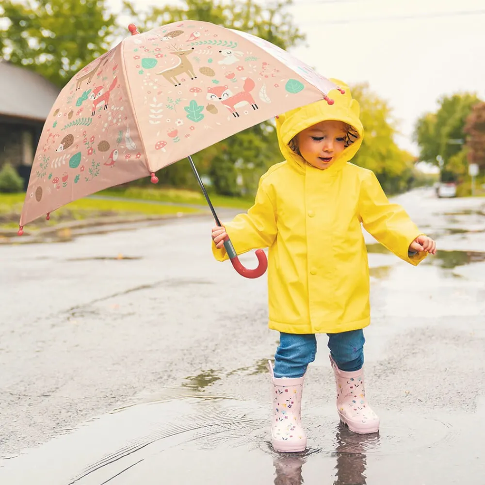 - Paraguas infantil con diseño estampado de animales del bosque.