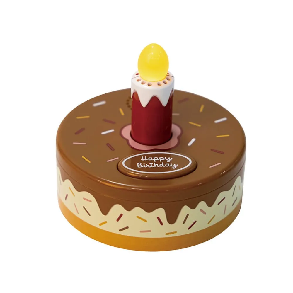 - Botón central para iluminar la vela, reproducir una canción de cumpleaños e iniciar la fiesta.