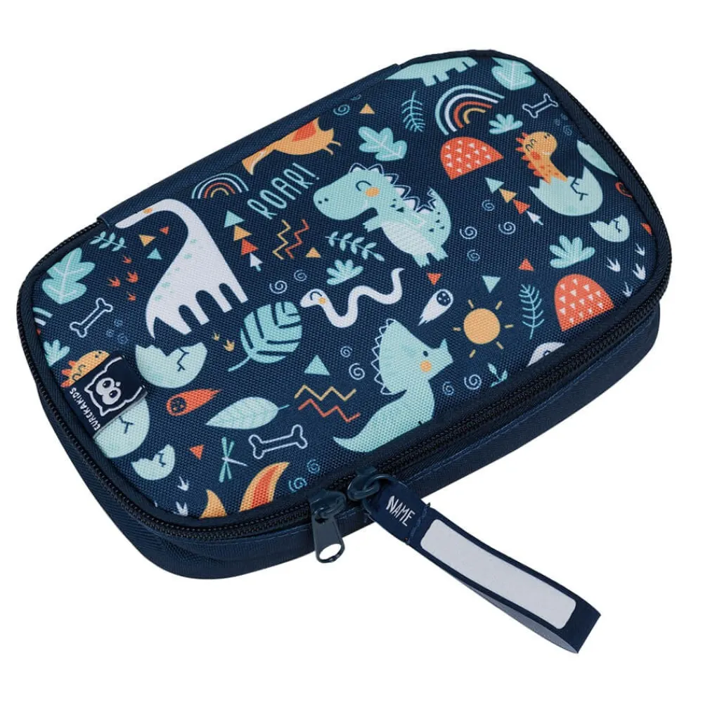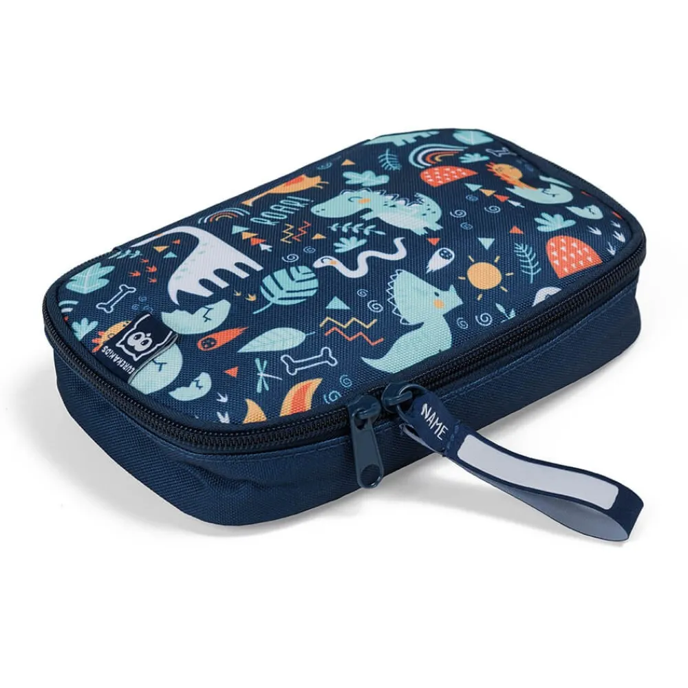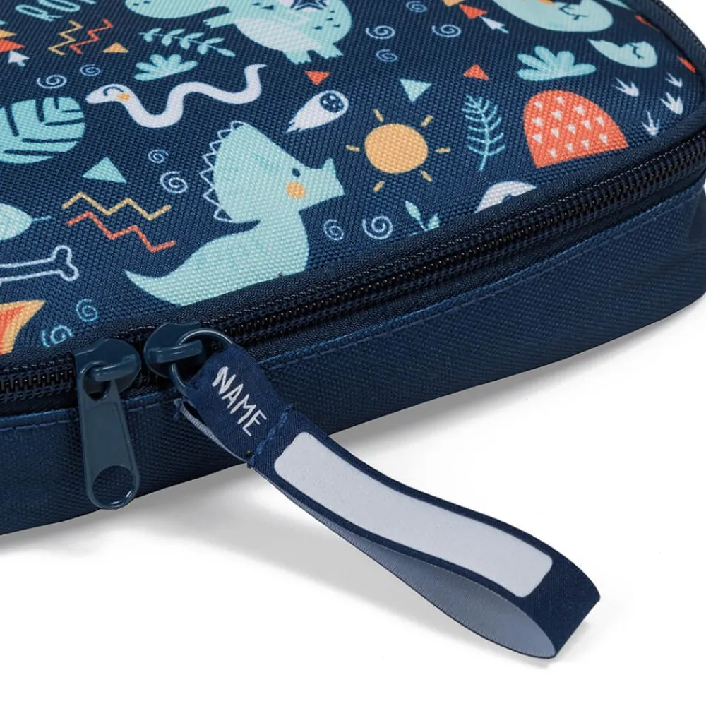 - Portabocadillos infantil de tela con estampado de dinosaurios.