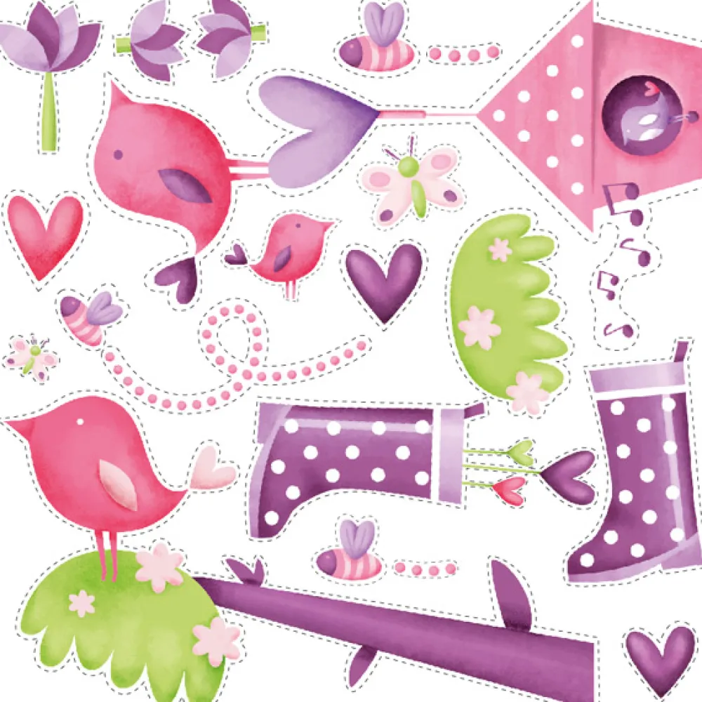 – El blister contiene 3 láminas con unos 19 stickers en cada lámina en distintos tamaños y formas: pájaros, mariposas, abejas, corazones, casitas, botas de agua, etc.,