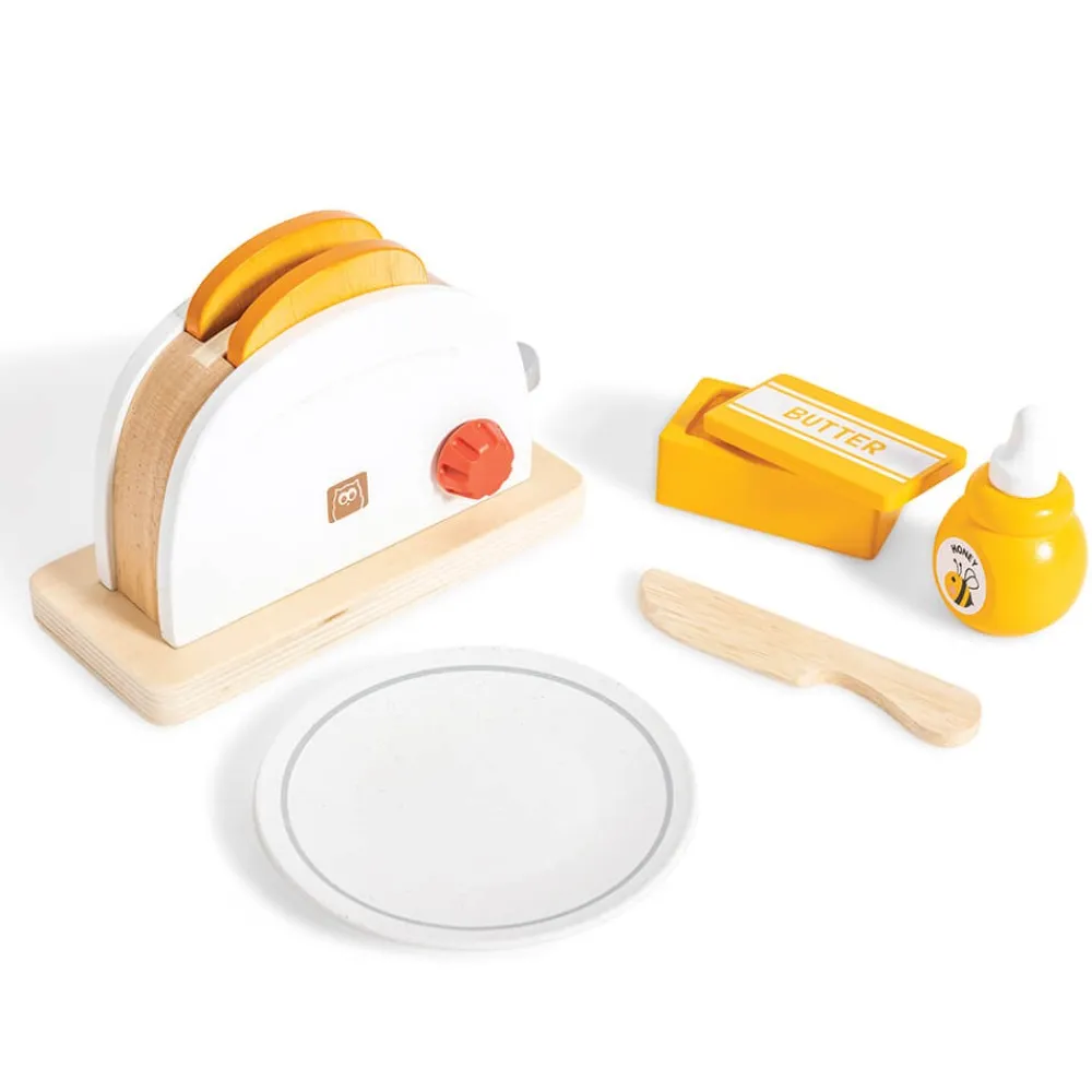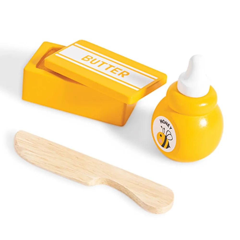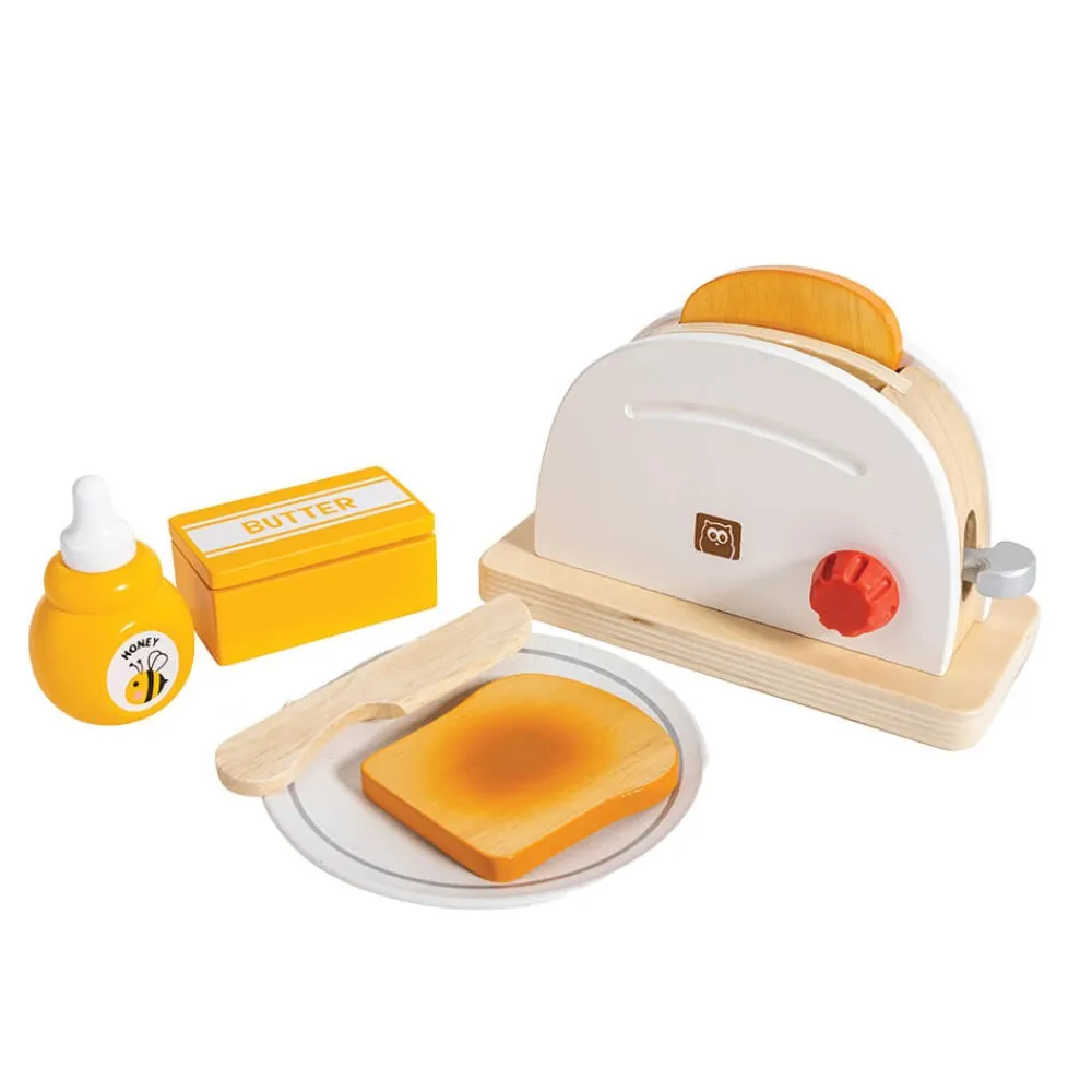 - El set incluye: tostadora, dos rebanadas de pan, un bote de miel, un cuchillo, un plato y un envase de mantequilla con tapa extraíble.