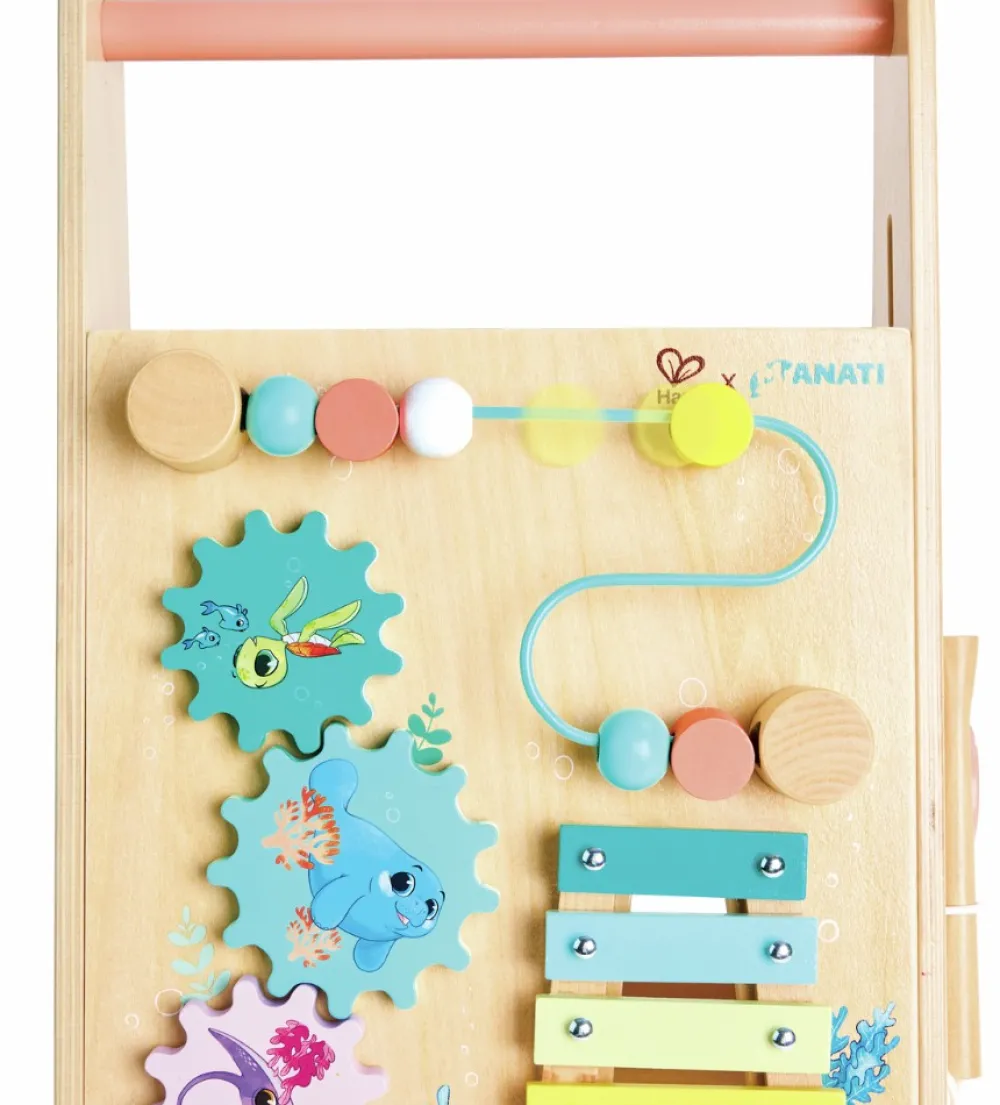 – Incluye 6 juegos distintos: Laberinto de figuras, engranajes giratorios, un xilófono, una rueda de formas, diferentes piezas para encajar en los laterales y un disco de madera para mover arriba y abajo.
