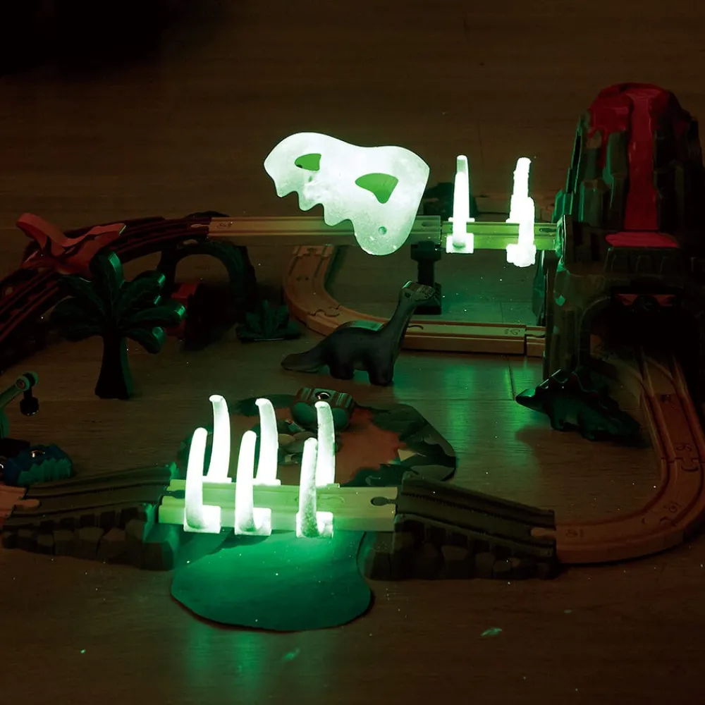 - Huesos y cráneo de dinosaurio que brillan en la oscuridad para una experiencia mágica.