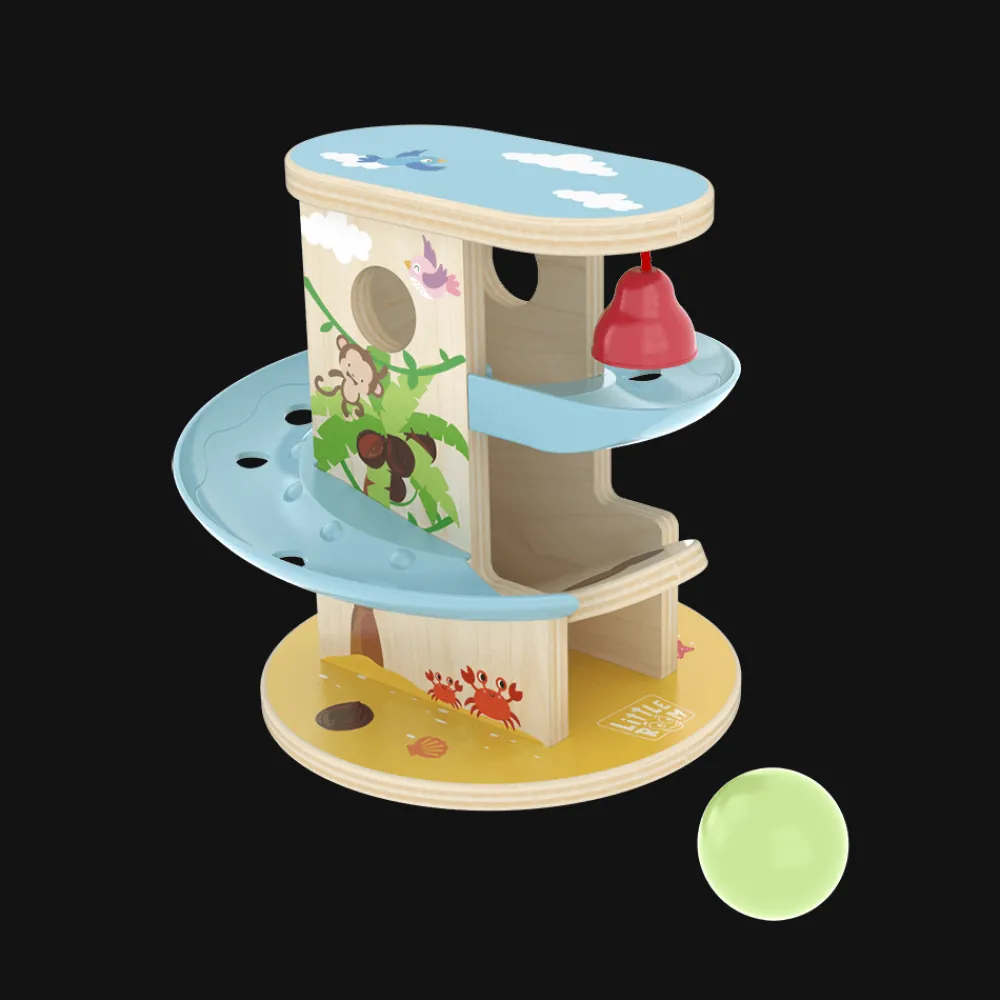 - Incluye bola de madera y mecanismo para devolverla a la cima.