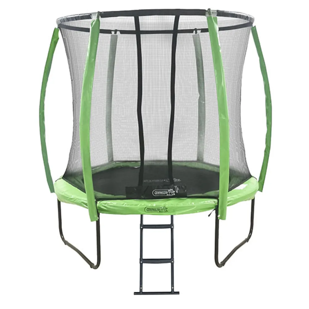 – Marco de 244 cm (diámetro) x 70 cm (altura hasta la cama elástica). La red protectora tiene una altura de 180cm. La medida total de la cama elástica con red de protección es de 250 cm