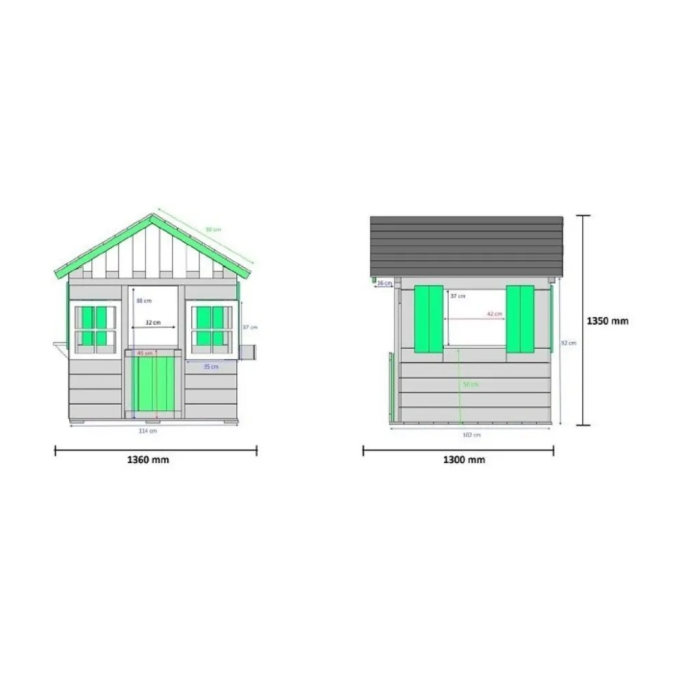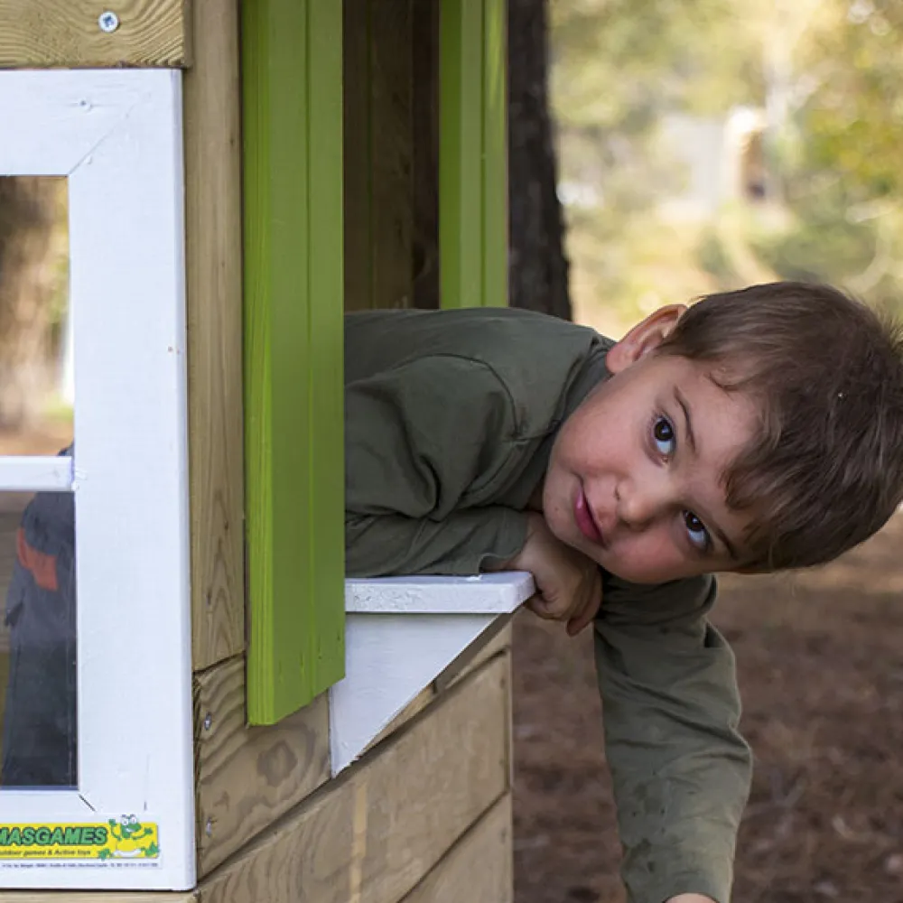 – La casita Lollipop está fabricada en madera de pino tratada para el exterior, procedente de bosques renovables en madera cortada en forma cuadrada que la hace muy fuerte y resistente.