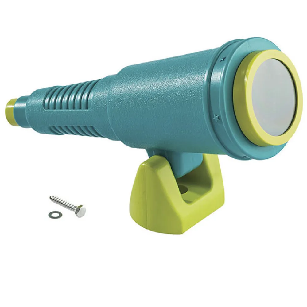 – El telescopio tiene una longitud de 41,8 cm. Gira 360 grados y se incluye el conector y el tornillo para fijarlo en un parque infantil de madera.