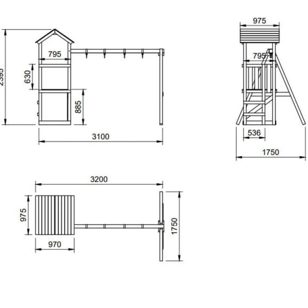 Medidas torre con columpio doble: 320 cm (largo) x 175 cm (ancho) x 239,5 cm (alto)