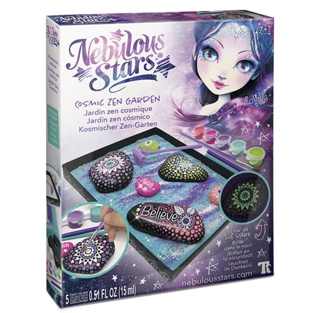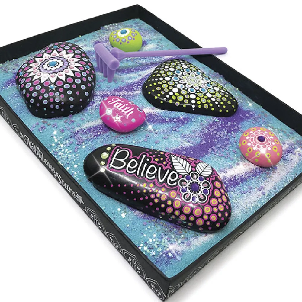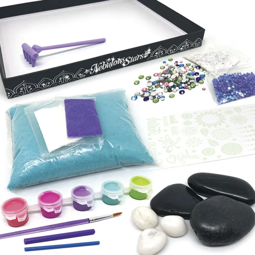 – Incluye: Jardín Zen, mini rastrillo, 6 piedras naturales, 5 colores acrílicos, 3 colores diferentes de arena, 46 pegatinas que brillan en las oscuridades, abalorios para decorar las piedras, 2 punteros y un pincel.