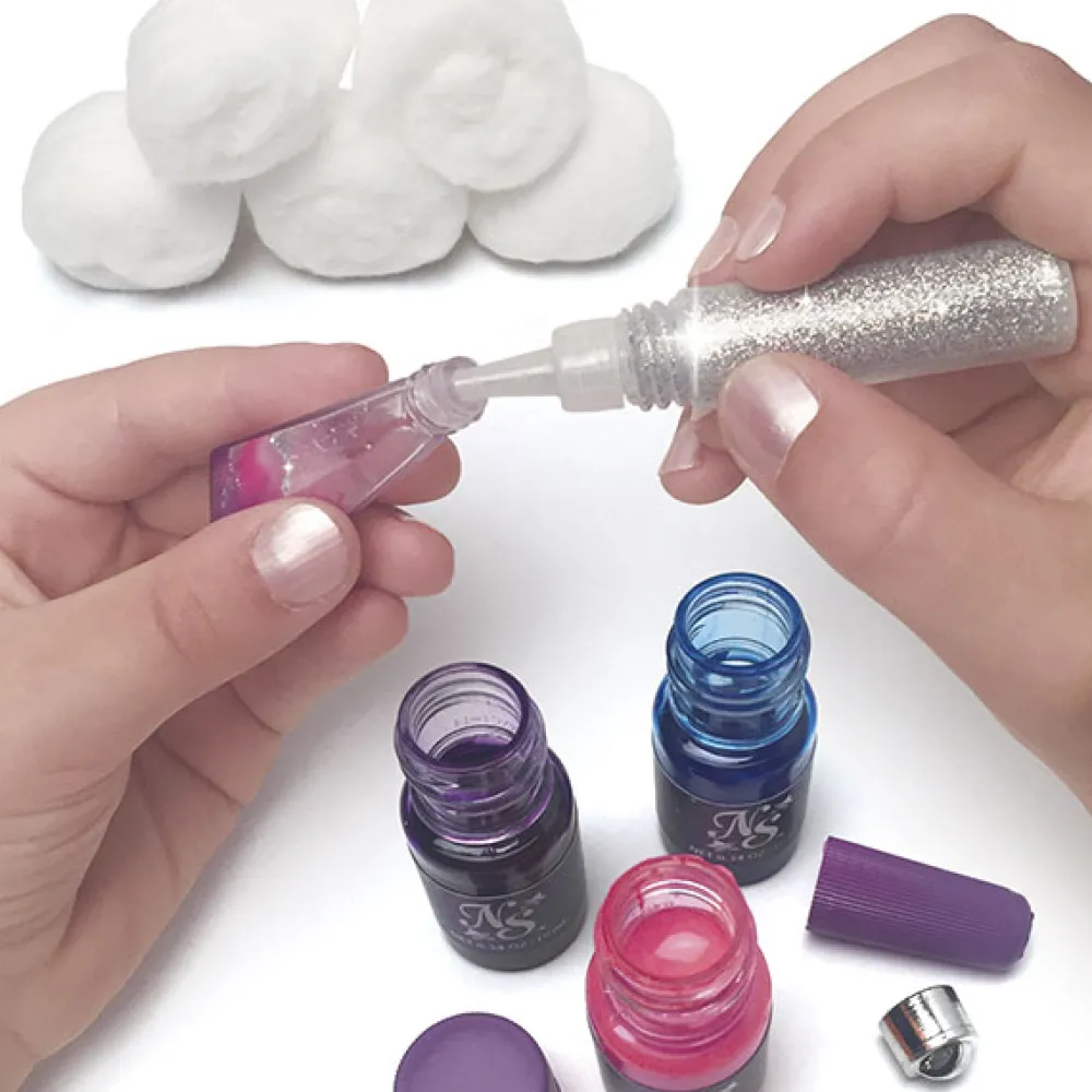 – Incluye: 5 botellitas para rellenar, un tubo de purpurina, 4 botellas de tinta, 3 colgantes, cinta elástica, 5 bolas de algodón y una pipeta de plástico.