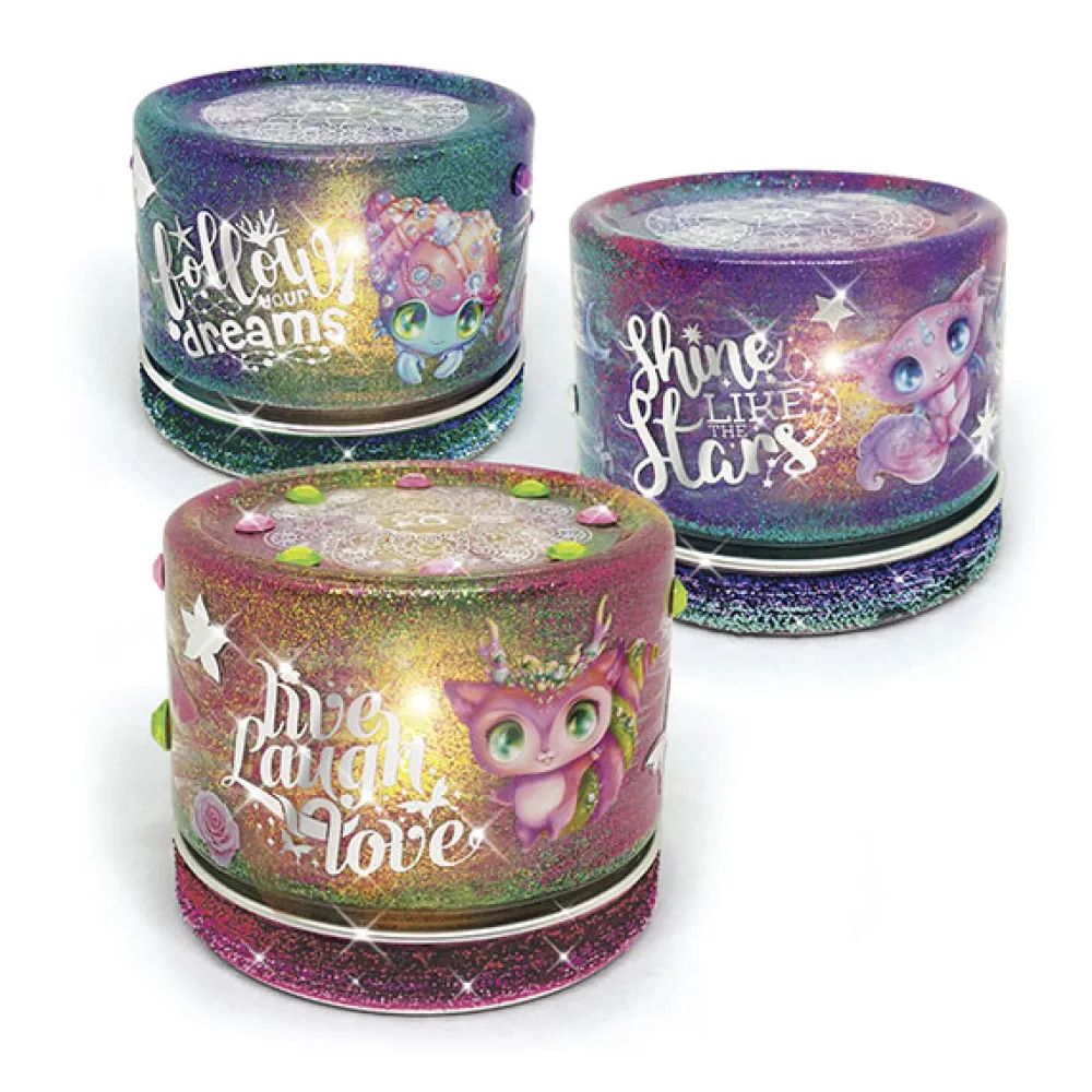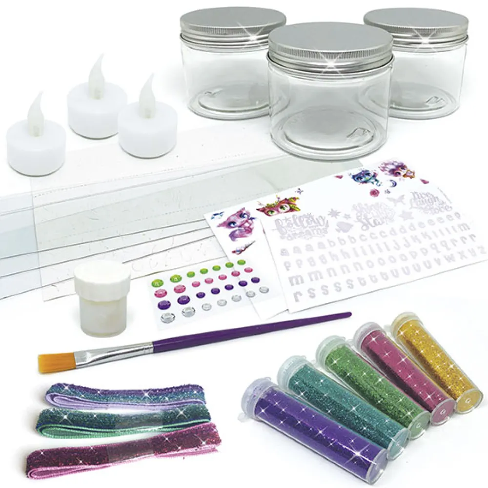 – Incluye: 3 tarritos pequeños de plástico con tapa, 3 velas, 5 tubos de purpurina, más de 100 stickers con diseños diferentes, superglue, pincel, papeles de plástico, 3 cintas brillantes e instrucciones.
